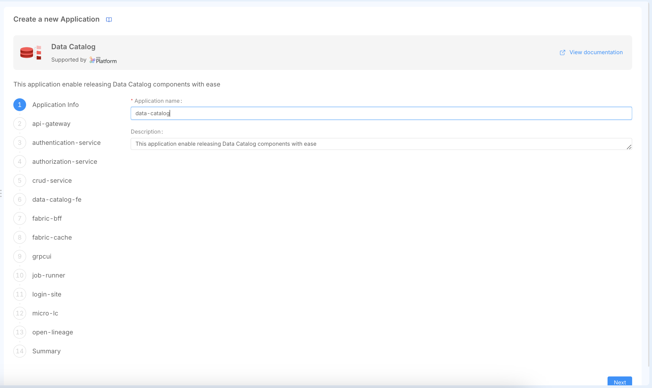 To configure the Data Catalog, you must first initialize the Data Catalog Application. To do so, navigate to the "Application" section in the Design Area of a Mia-Platform Project and search for the "Data Catalog" application. Then, follow all the steps to complete the initial setup. These steps will create all the necessary microservices and routes.