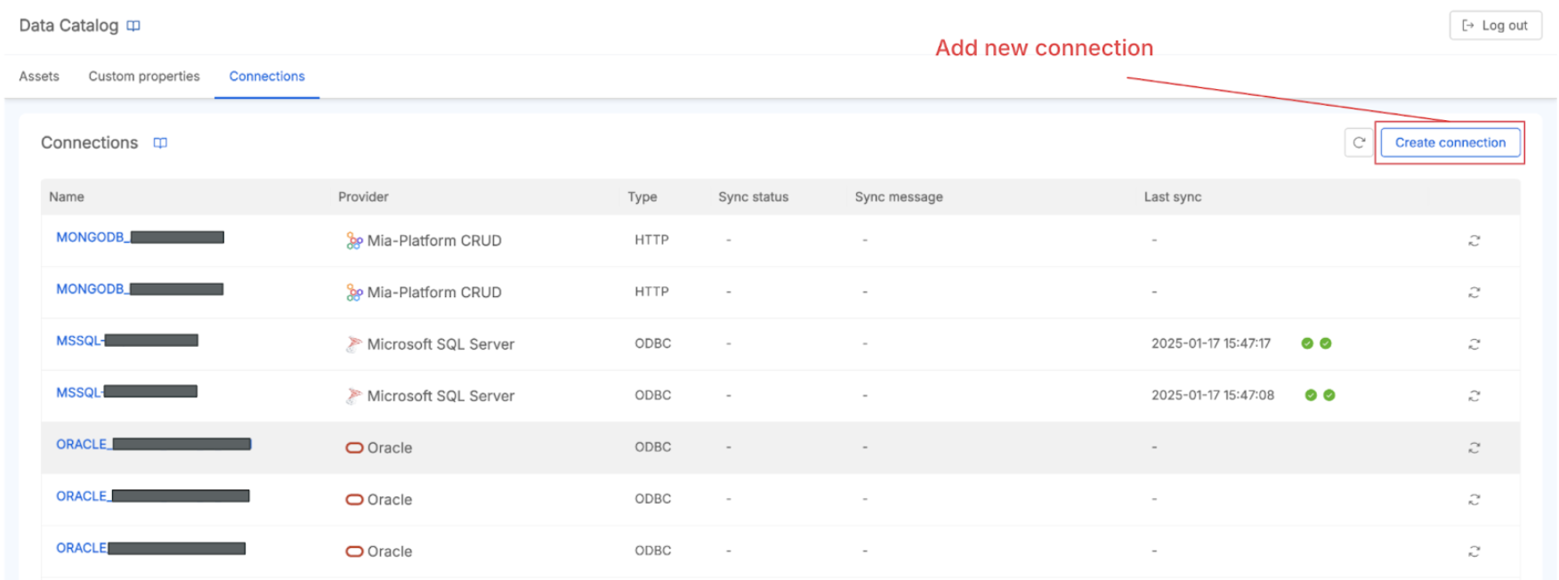 Connections Management is a core feature of the Mia-Platform Data Catalog, allowing users to add, edit and synchronize external data sources to retrieve their assets. These connections are typically configured from the Data Catalog's frontend interface, and the Fabric BFF component is responsible for managing these configurations.