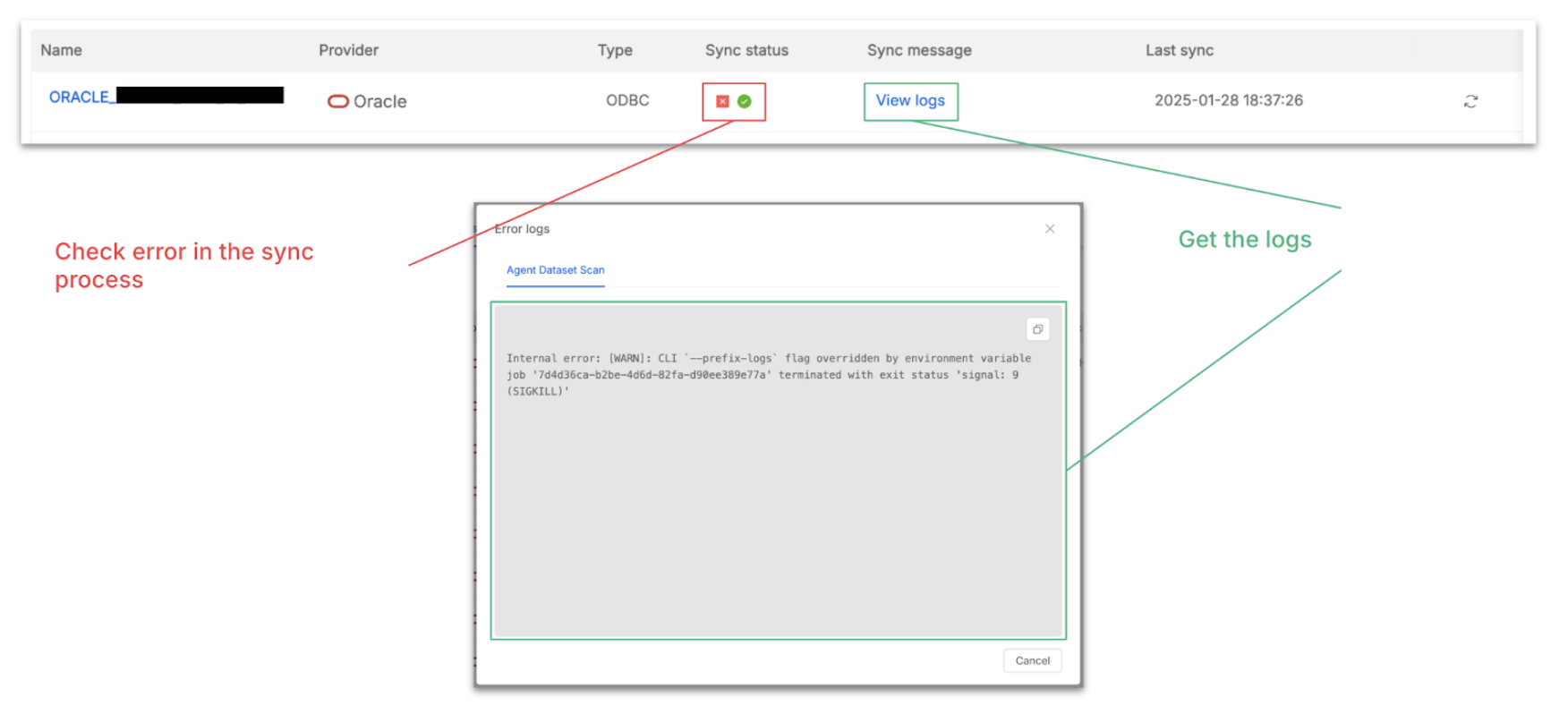The Connection page allows you to check all available connections. From here, for each System of Record, you can force a new sync of metadata from its data sources. If problems occur, you can also get the sync status and access the logs to troubleshoot.