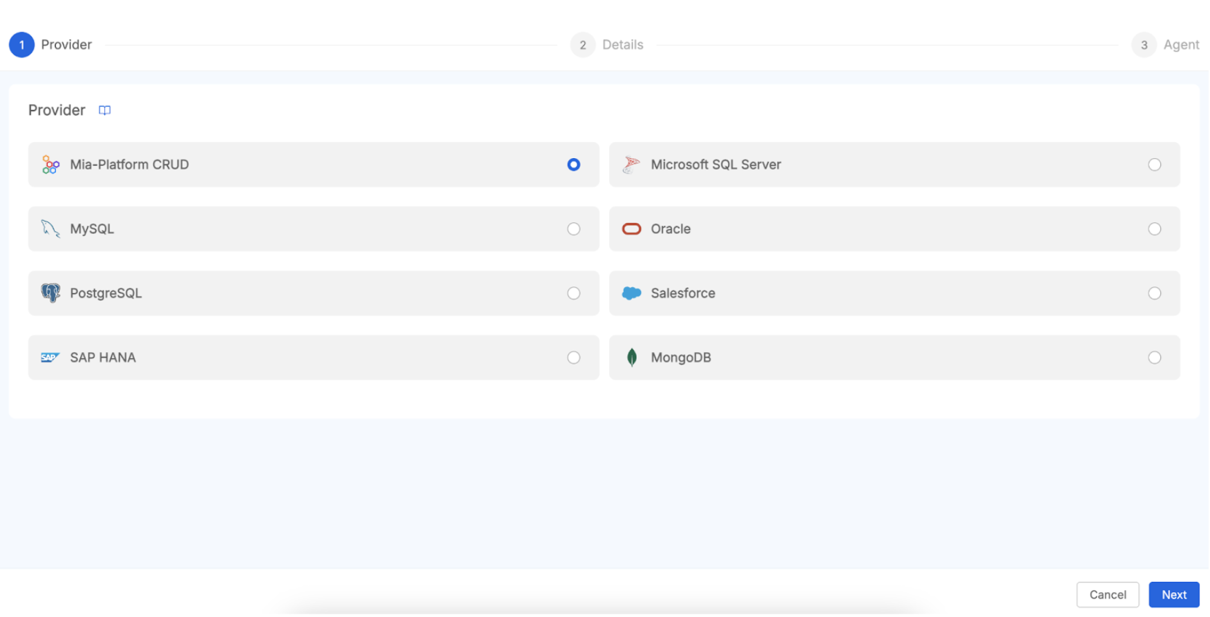 Once the CRUD service is ready, you would navigate to connections management in Data Catalog. Within the Mia-Platform Data Catalog UI, you'll find a "Connections" or "Connections Management" section, which is the designated area for managing all your data source connections. Here, you will add a new connection for the Mia-Platform CRUD Service. When initiating this process, you'll select "Mia-Platform MongoDB CRUD Service" as the connection type from the comprehensive list of supported Systems of Record.