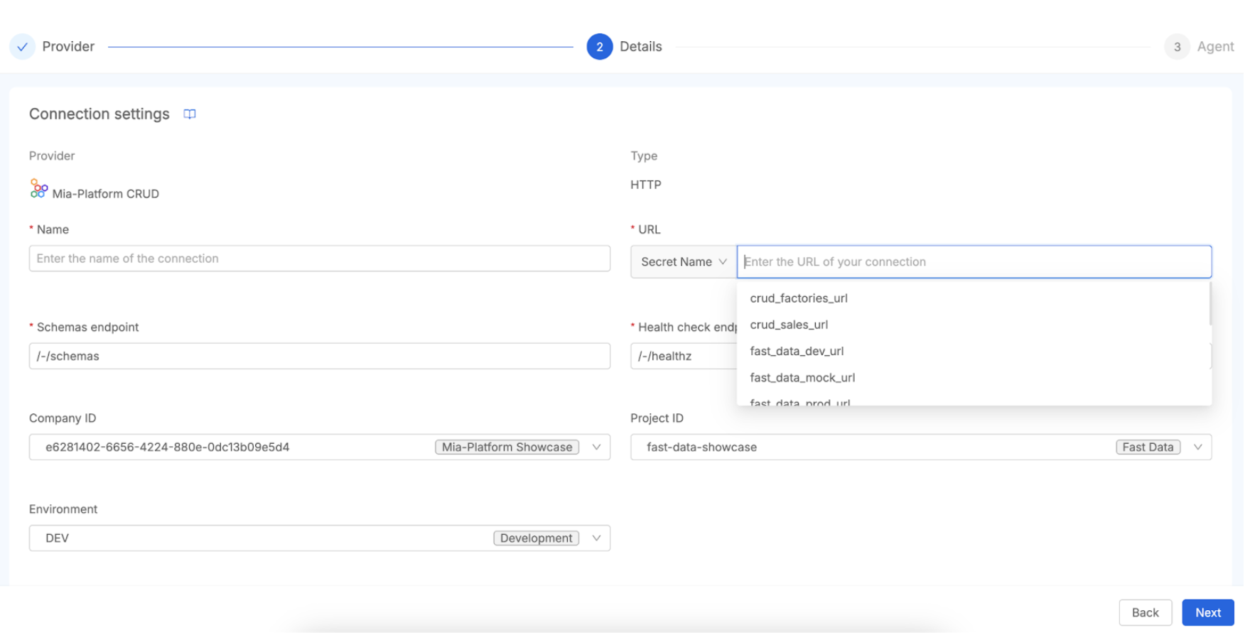 To connect the Data Catalog with your Mia-Platform CRUD Service, you will need to provide specific configuration details. First, establish a unique name for this particular connection. Next, you must specify the base URL or endpoint of the CRUD Service. This URL can also be taken from a secret name defined within the secret.json config map of the Job Runner service.