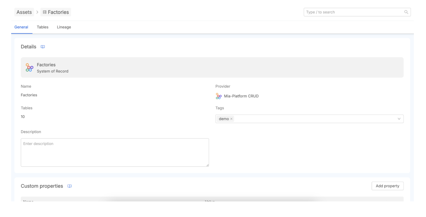 While automated metadata scraping provides a foundational layer of technical information, its true value is unlocked through metadata enrichment. This is the process of enhancing the existing metadata with additional contextual, business-relevant information. The Mia-Platform Data Catalog provides full management capabilities through its UI.