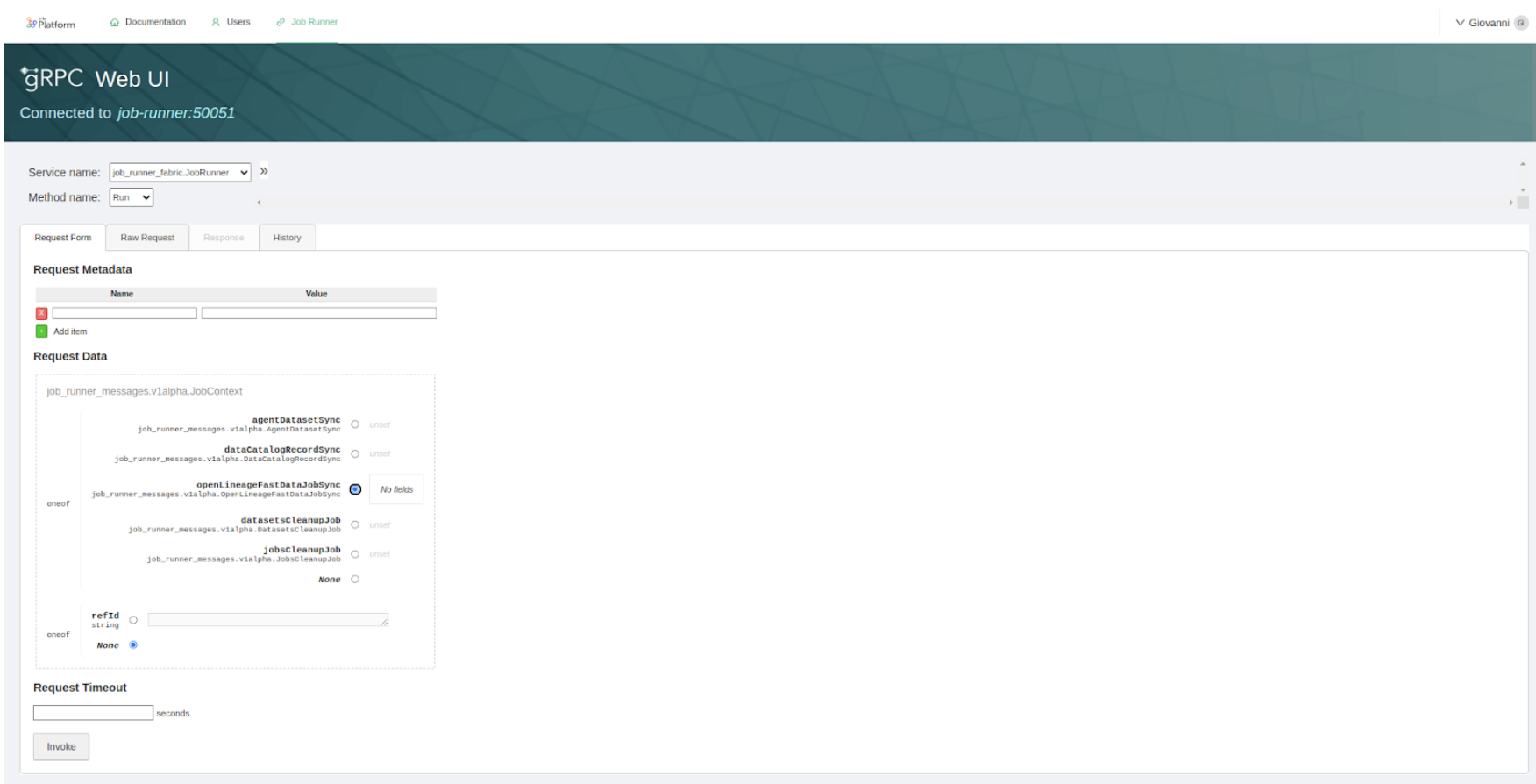 From there, you can pick the JobRunner service, choose the Run method and then pick the openLineageFastDataJobSync option as request. You need also to specify the name of the producer as a string parameter: this information will be displayed in the Data Catalog UI Job Details section.