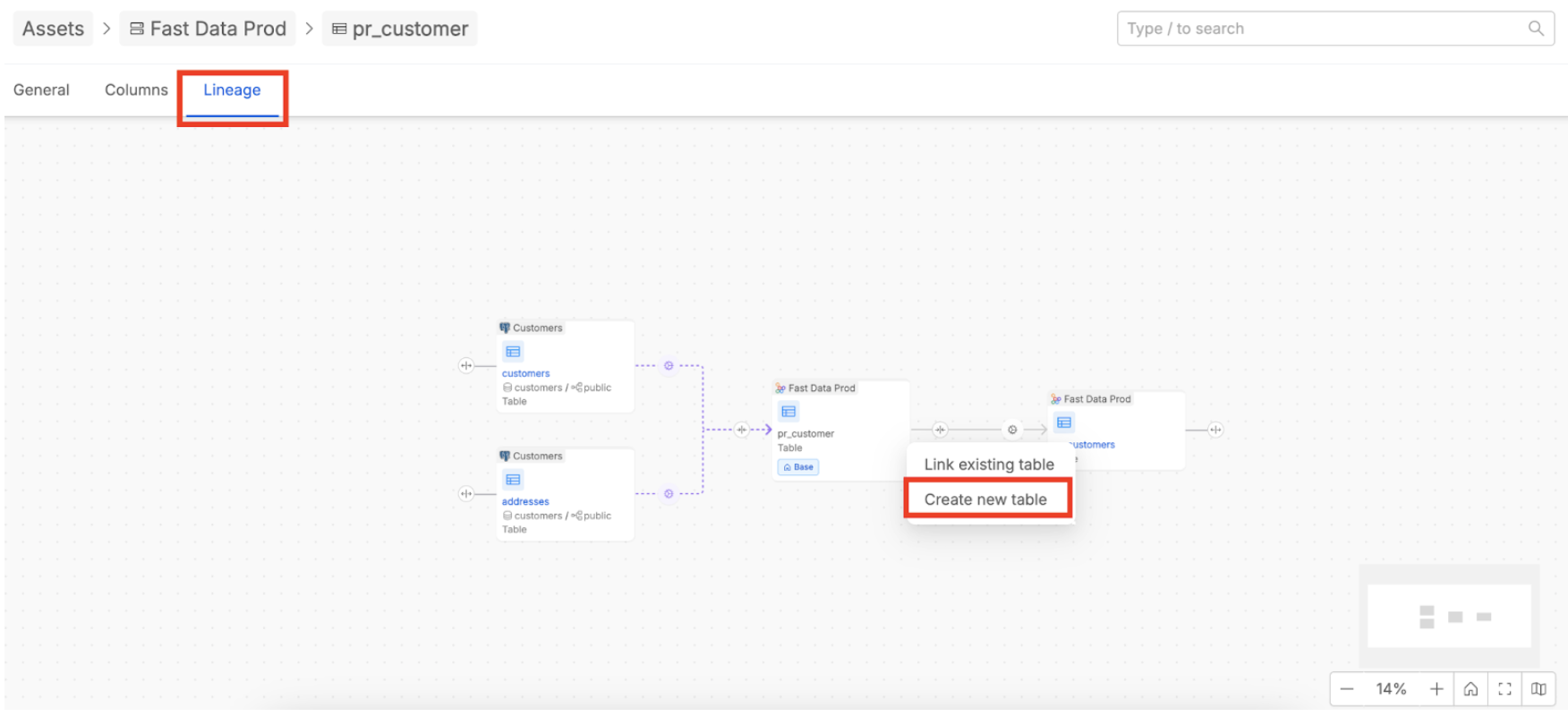 To create virtual elements, navigate to an asset within your data catalog, such as a System of Record (SoR) or a Table, and then select the "Lineage" tab.