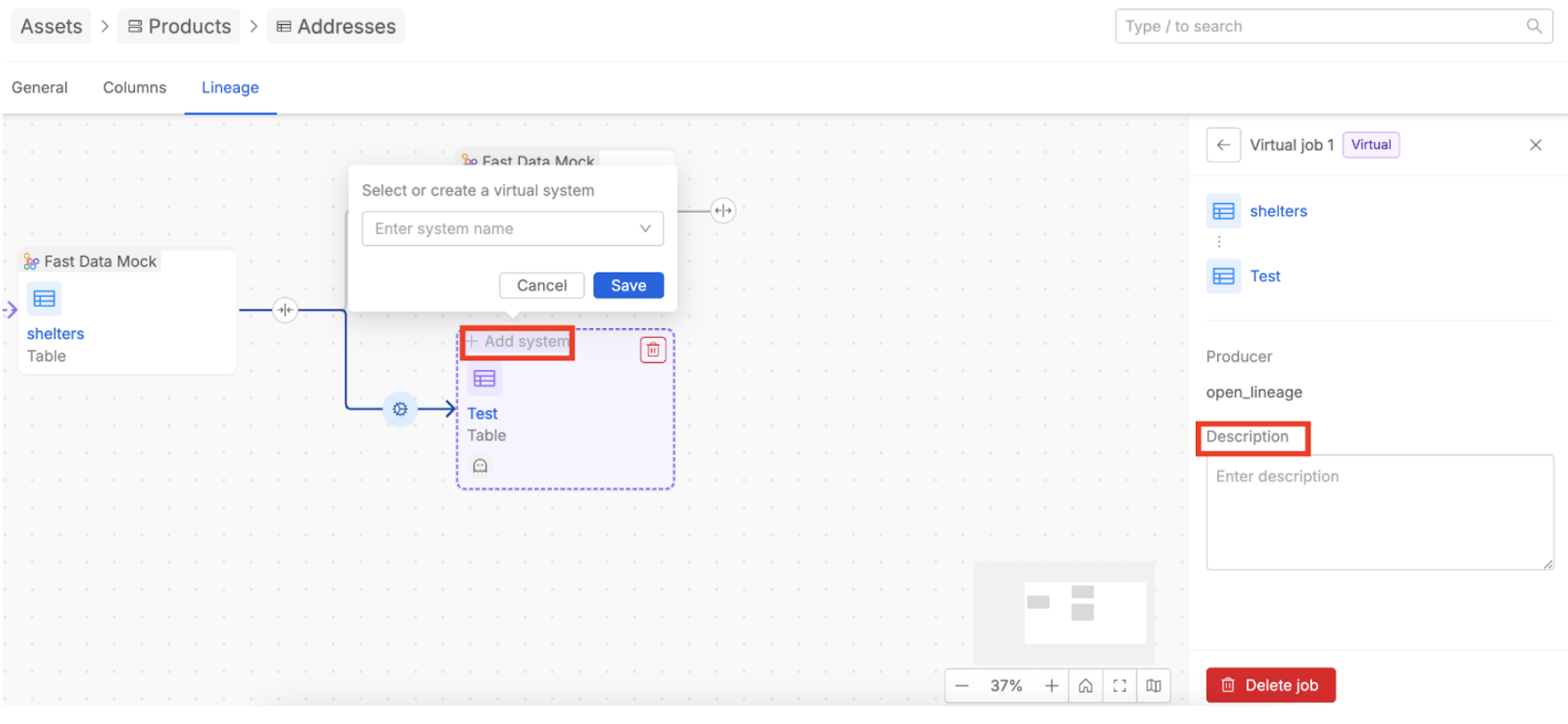 Here, on the right-side of an asset element displayed in the lineage flow, you will find a plus button. Click this button and use the “Create new table” option to add a virtual asset. Once the virtual table is created, you can associate it with an already available virtual SoR or create a new virtual one. Virtual jobs are automatically created in the process to connect the assets and can be enriched simply by adding a description.
